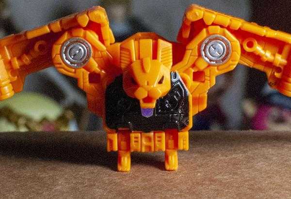 In bat mode, Wingthing is an extremely faithful (and kind of adorable) replica of Ratbat’s snout-nosed bat mode. He’s missing his back-mounted weapons, but they’re not missed like they were with Frenzy, due to them not being as big of a part of his silhouette. His colors are also pretty plain in this form, being solid orange with some black bits, silver circles on his wings, and a Decepticon tampograph. He’s basic, but he looks good.