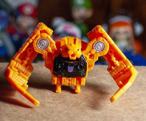 A few short steps later, and the pair are in their robot modes. I’ll be honest here: This sculpt doesn’t make for the best Frenzy/Rumble. Despite their small size, previous versions of these characters have always had mostly humanoid proportions, even the original toys. This version, however, is extremely stumpy, with a wide torso, and short arms and legs. On top of that, he’s lacking any representation of his traditional back-mounted guns, or piledriver arms (save, possibly, for some pegs on the ends of his fists.) It’s mostly noticeable because the sculpted detail on him is very much trying to replicate his G1 self outside of this, whereas if it had been a more original take on the design (like his Fall of Cybertron Data Disk iteration) it would have stood out less.