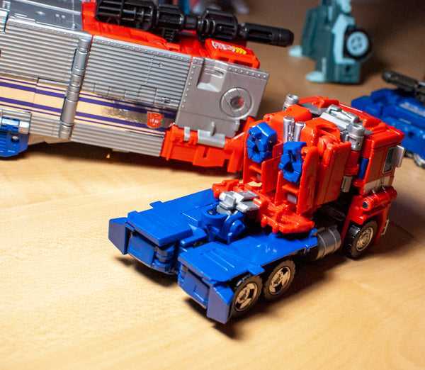 The whole thing rolls well (even if all of the wheels don’t touch the ground), and the cab clips onto the trailer nicely. You can stash his (G1-style) gun uptop to help make this look a bit more like Star Convoy’s original altmode, too.