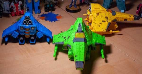 It’s the colors that’s the big difference, and not to beat around the bush: These figures are cheaper than they usually would be simply because they have less paint, and they have less paint because they’re replicating the cartoon’s block colors. In addition, the three of them share the exact same set of paint apps between them, with only the base plastic color being changed. For what it’s worth, once I got them in hand, they don’t look nearly as plan as I expected. They still have paint apps on their chests, wings, and feet breaking up the monotony, they just noticeably have a lot less deco than the mainline Seekers. It does highlight one specific problem on them, though: The now-familiar Siege battle damage, realized here as grime coating their lower arms and lower legs, is the exact same “random” pattern between the three of them, and it brings the set down to see it replicated exactly. I wish they’d sprung for a different pattern, or made it randomized. One upshot of the plainer decos is that they make the the intense Siege over-detailing that was very obvious on Starscream way less visible here.