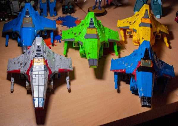 They still change into a group of alien jetfighters that make me think of old Star Wars Expanded Universe vehicles, They also manage to look really cohesive thanks to their details being 80 percent shell. They also still have obvious robot legs and arms on the bottom, but they’re still just as fun to grab by the hand and swoop around. And now there’s a fleet of them!