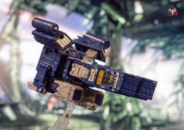 Soundwave’s got three additional weapons: A cylindrical machinegun-looking weapon that’s meant to mount on his left shoulder, but can go other places. He’s got a second cylinder, meant to be handheld, with a grey spiky thing that you can pull out of it.