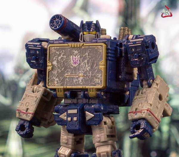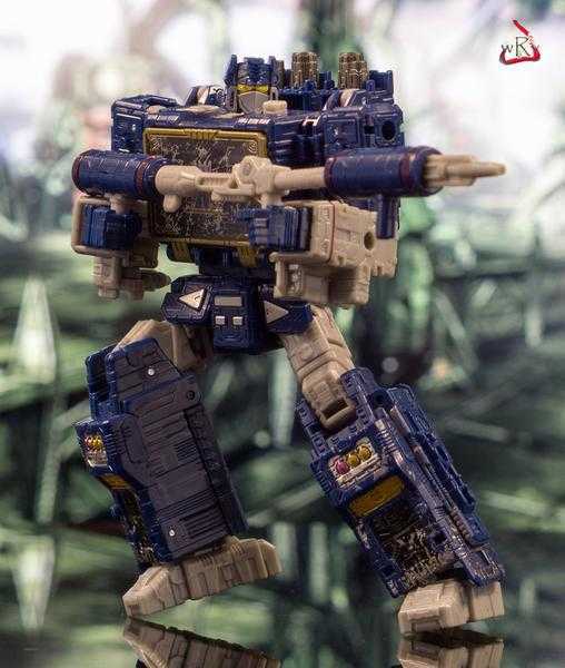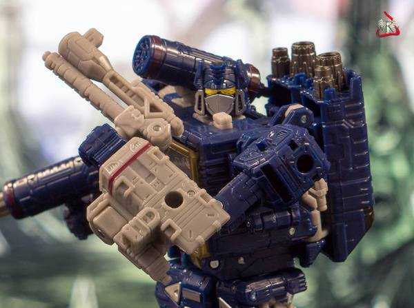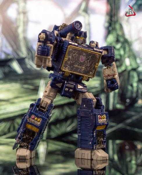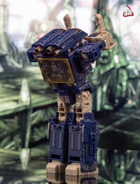 His colors are a bit different from how Soundwave’s usually been portrayed, in that he’s a darker blue than most iterations. Also, they decided to make him original-toy-accurate when it came to his eyes, which are yellow instead of red. They glow nicely when held up to the light, thanks to being cast in clear plastic, with a “window” on the back of his head. Soundwave’s slathered in paint, more so than most of the other Siege Voyagers, and he’s covered in gold, red and silver accents all across his body. It really looks like they went all-out on his paint budget.