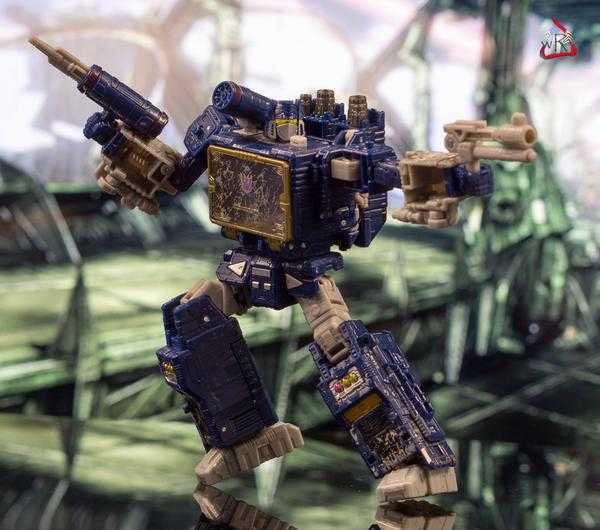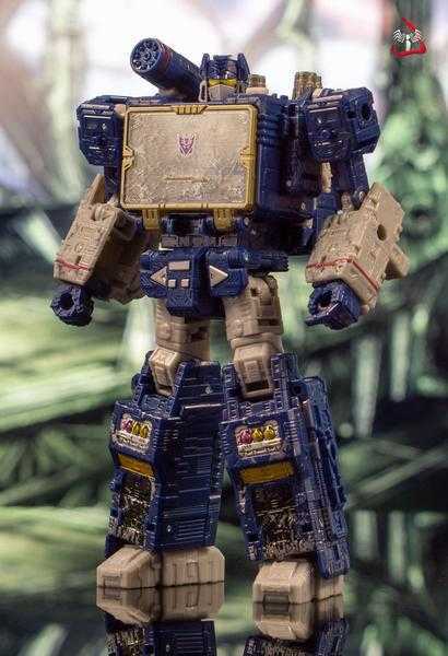 In terms of sculpt, Soundwave is extremely faithful to his 80s cartoon design, to the point where he includes cassette player details despite not changing into one, including buttons on his waist, an eject button on his shoulder, and speakers on his legs.