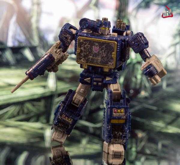 Poseability-wise, he’s got the same extra joints as the other Siege Voyagers, like ankle tilts, though he lack wrist swivels, thanks to his transformation. Despite that, he can, as mentioned before, press his own eject button. It’s amazing how despite being so boxy, you can make him look dynamic. Now, onto the gimmicks. And here’s an issue, on his own, his main gimmick doesn’t do much: Pressing onto his eject button makes his chest pop open, and that’s it. However, if you have the Micromaster Spy Patrol (reviewed here), one of them can be stashed in his chest, like his classic microcassettes. The thing is that basically every previous Soundwave toy that still had some variety of his classic “store and eject minions from his chest” gimmick either came with one of those minions in box, or at least some other object he could store and eject. This is the first time he hasn’t come with anything to work with in the package with him. So, unless you’re getting the Micromaster cassettes, it doesn’t do much, which is disappointing.