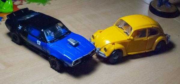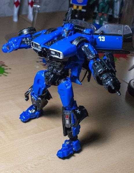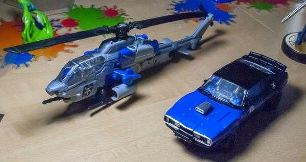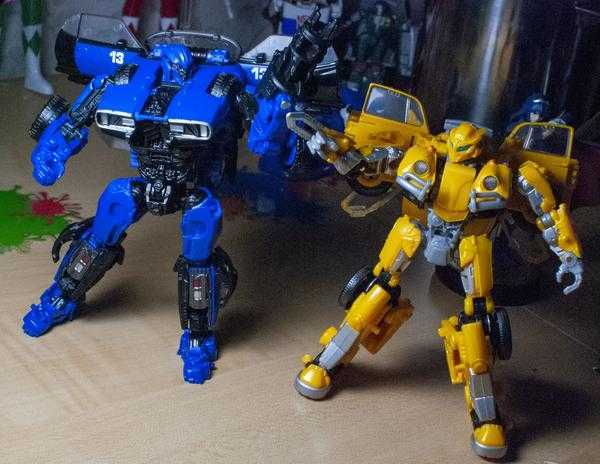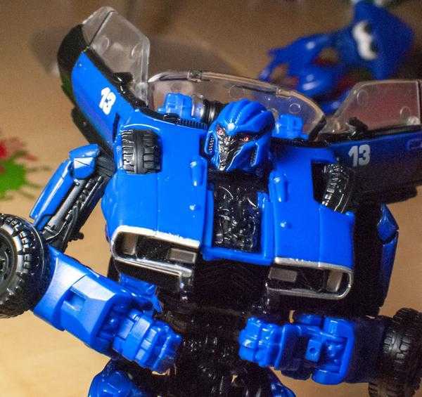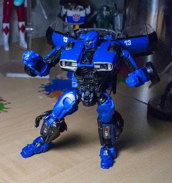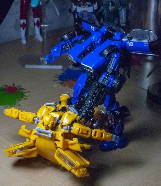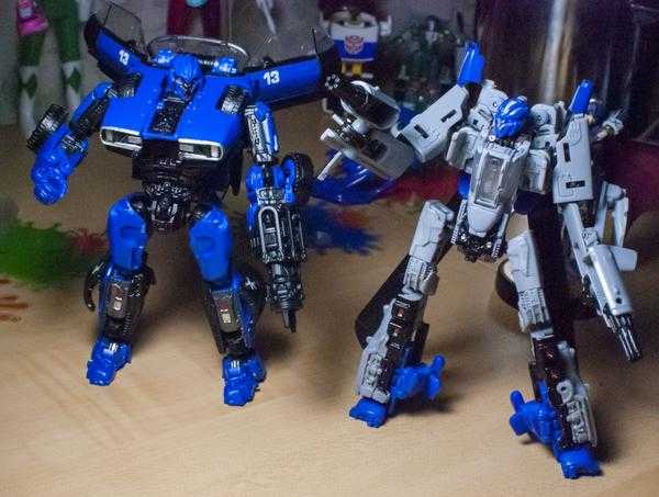 So, let me explain it, because it can get a bit confusing: In the film, both Dropkick and Shatter start out on Earth transforming into muscle cars, and then, a few scenes later, scan secondary flying modes (a helicopter and jet), becoming triple-changers in the process (and getting slightly different robot mode designs). No toys have tried to replicate their triple-changing ability, thanks to the complexity of the design, and instead, each toy has picked one mode to change into.