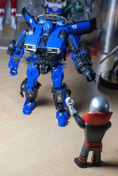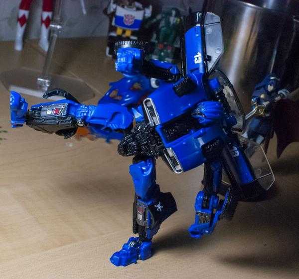 Studio Series figures sometimes have a problem with being painted enough, but this isn’t one of them. He looks nice in dark blue and black, with bits of shiny silver detailing. His tiny red painted eyes look suitably menacing, too. One little detail I like is the painted fake headlights on his legs, since the figure doesn’t totally replicate the film transformation.