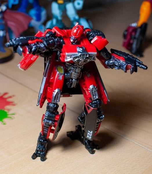 Like Dropkick, Shatter started out transforming into a muscle car, then later acquired a second jet mode. This figure just does the muscle car form, with the rumored future release being the jet version (2020 edit: Confirmed, and out now!). And it’s a mean-looking red car, with a big exterior engine, a roll cage, and spotlights on top. It’s not the most-painted vehicle mode (its upper floodlights and its wheels are solid black), but it does look good in red, black and silver. The wheels on the car are weirdly high, but that just means it rolls with absolutely no problem. It holds together really well, too.