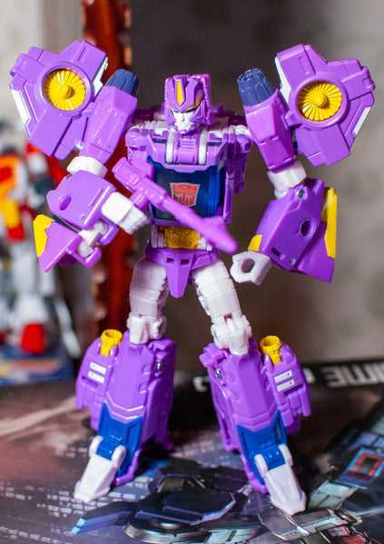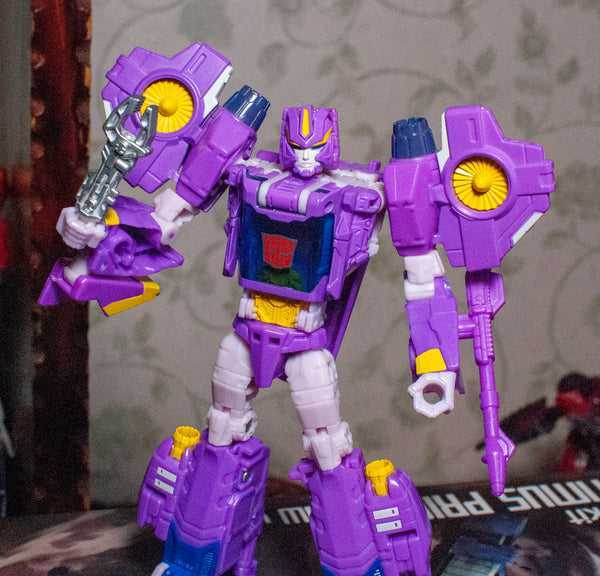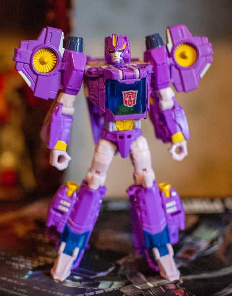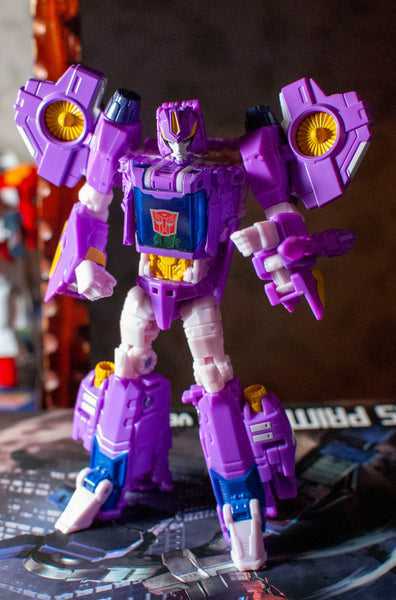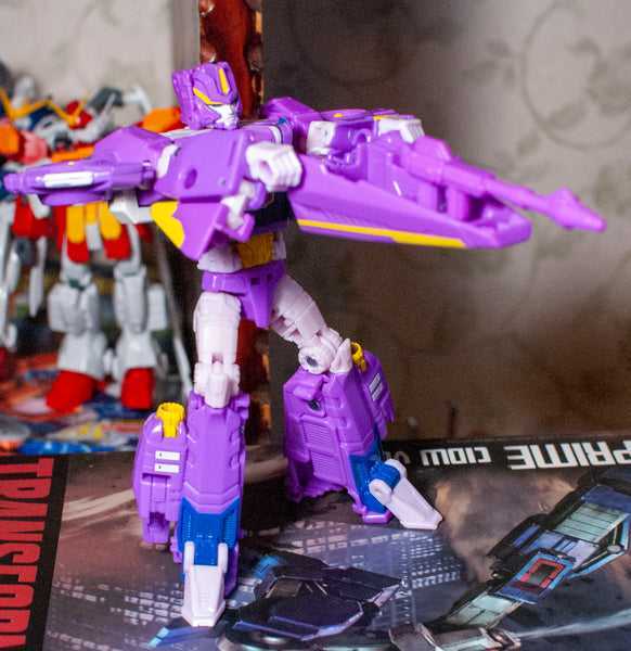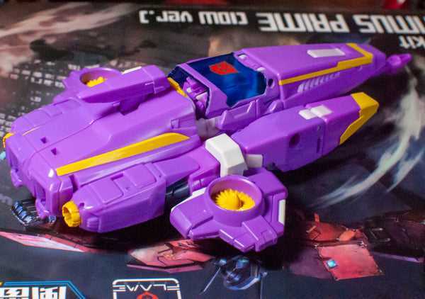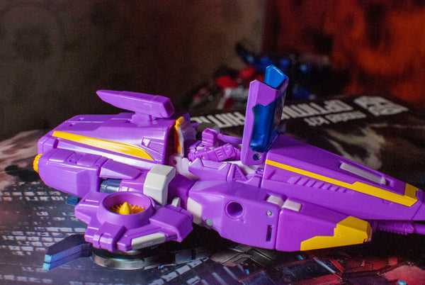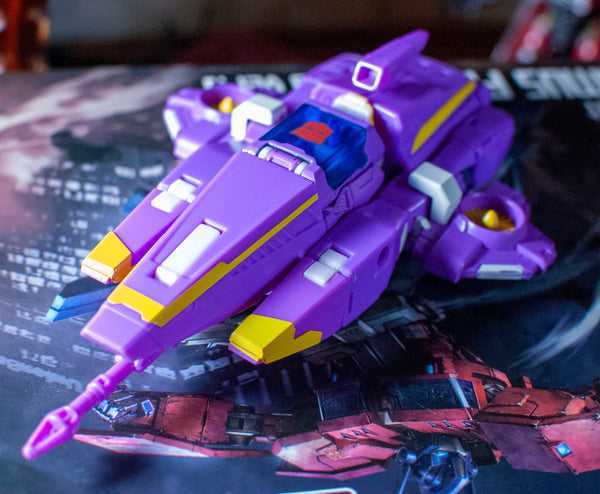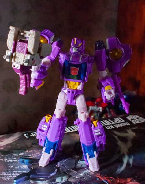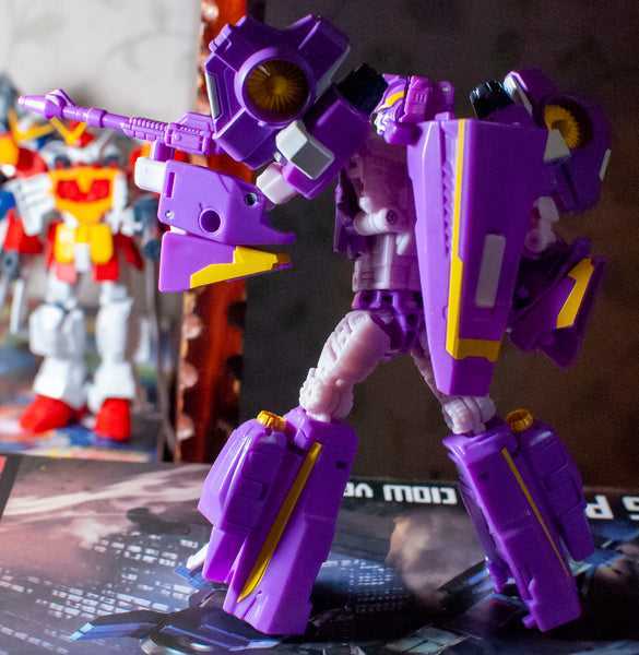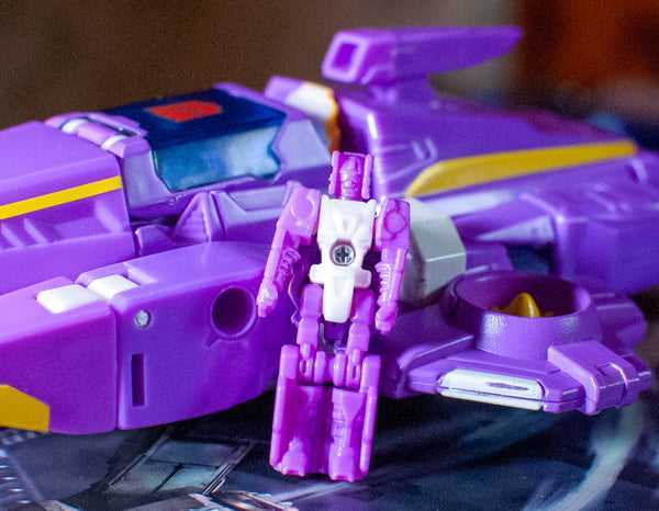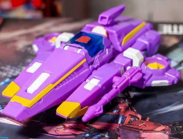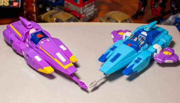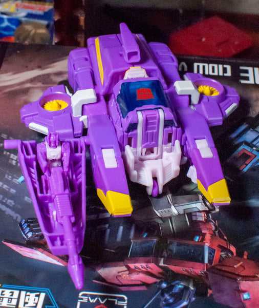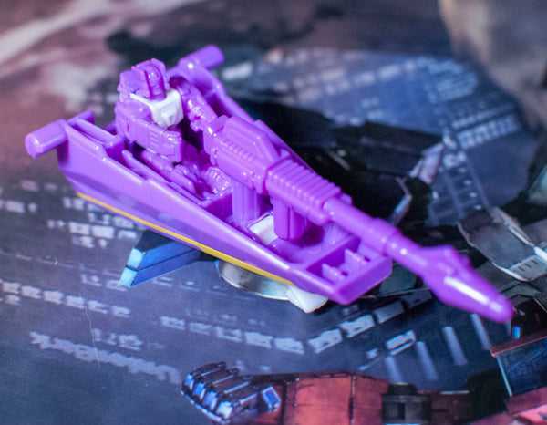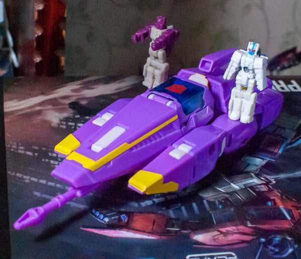 Pop them off, and it’s just Purple Blurr, complete with little antenna thingie uptop. Pop them on, and the drastically changed silhouette instantly scans not as a racer, but as a late-G1 pseudo-spaceship, which her altmode basically is. It’s not perfect, but it’s close enough. Of course, the biggest question is why a submarine/spacecraft hybrid would have an open cockpit, but hey, robots don’t need to breathe, right?
