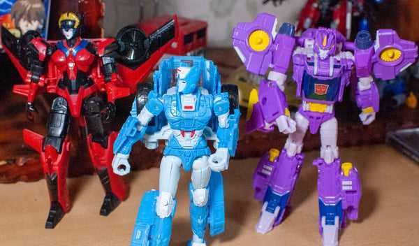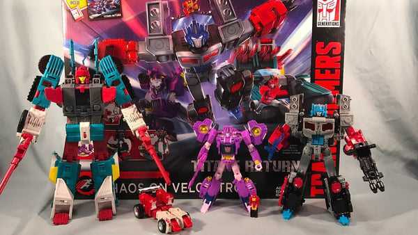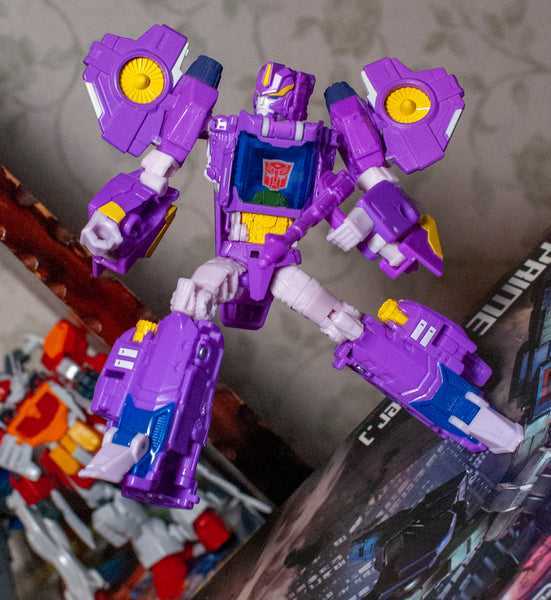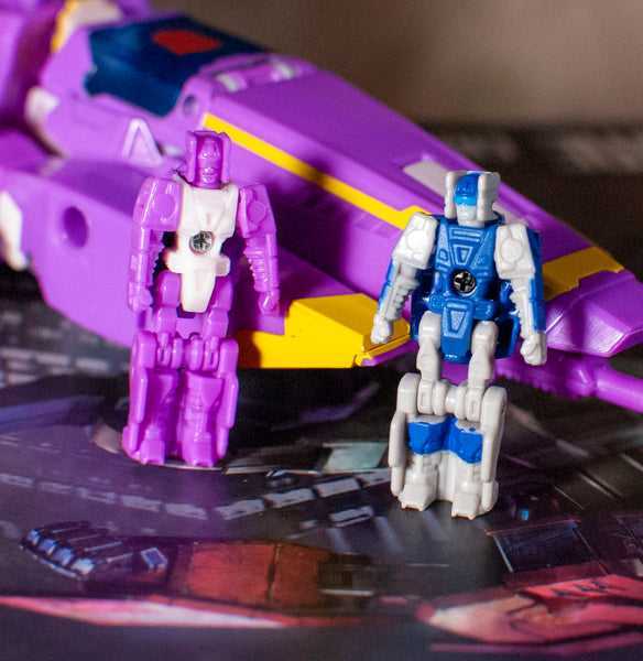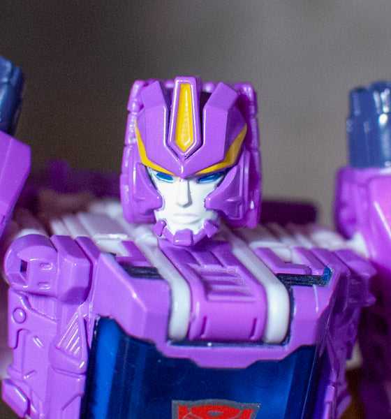 So, a strange thing about this boxed set in general was that it didn’t properly name any of the Titan Master partners. We’d later learn their names from other Hasbro press things. Either way, Parsec is Blurr’s partner, Hyperfire, with a new robot face on the back. She generally got the short end of the stick deco-wise, in that she’s totally unpainted, just cast in bright purple and dull lavender. This was an occasional problem throughout the Titans Return line, with it being random how much deco a partner would get, but particularly disappointing to see in an exclusive like this.
