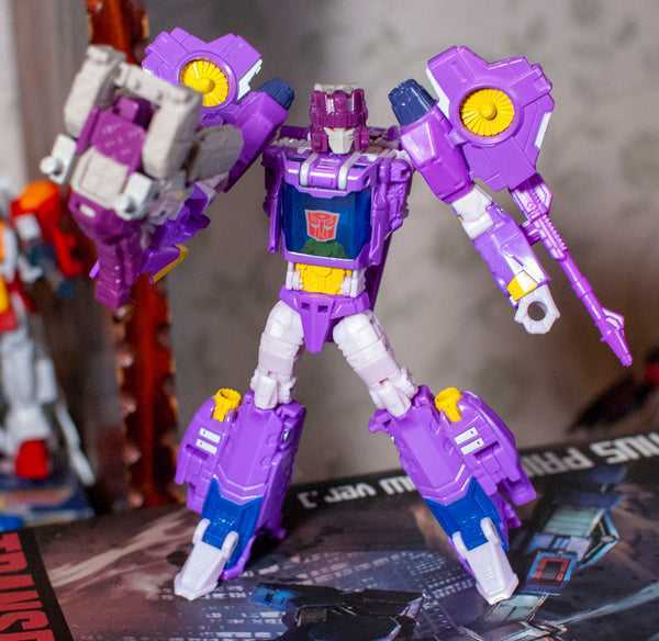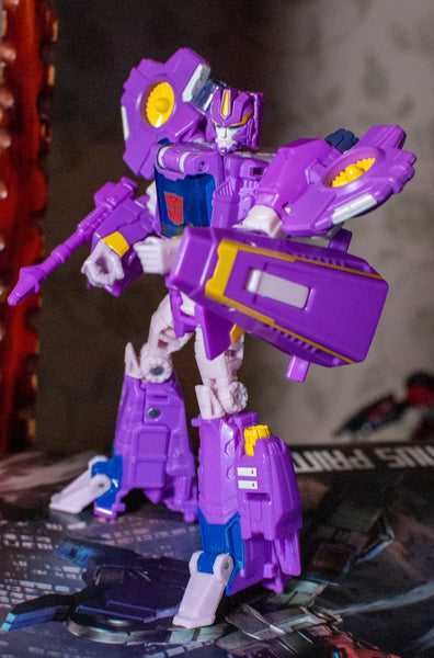 We’ve got the new head uptop, and the new fans on her shoulders (that once again can be given to other iterations of the mold), but this mode’s body is, once again, Purple Blurr, without any other real retooling. But I said it before, and I’ll say it again: Blurr’s lithe speedster body really does translate well into a female character.
