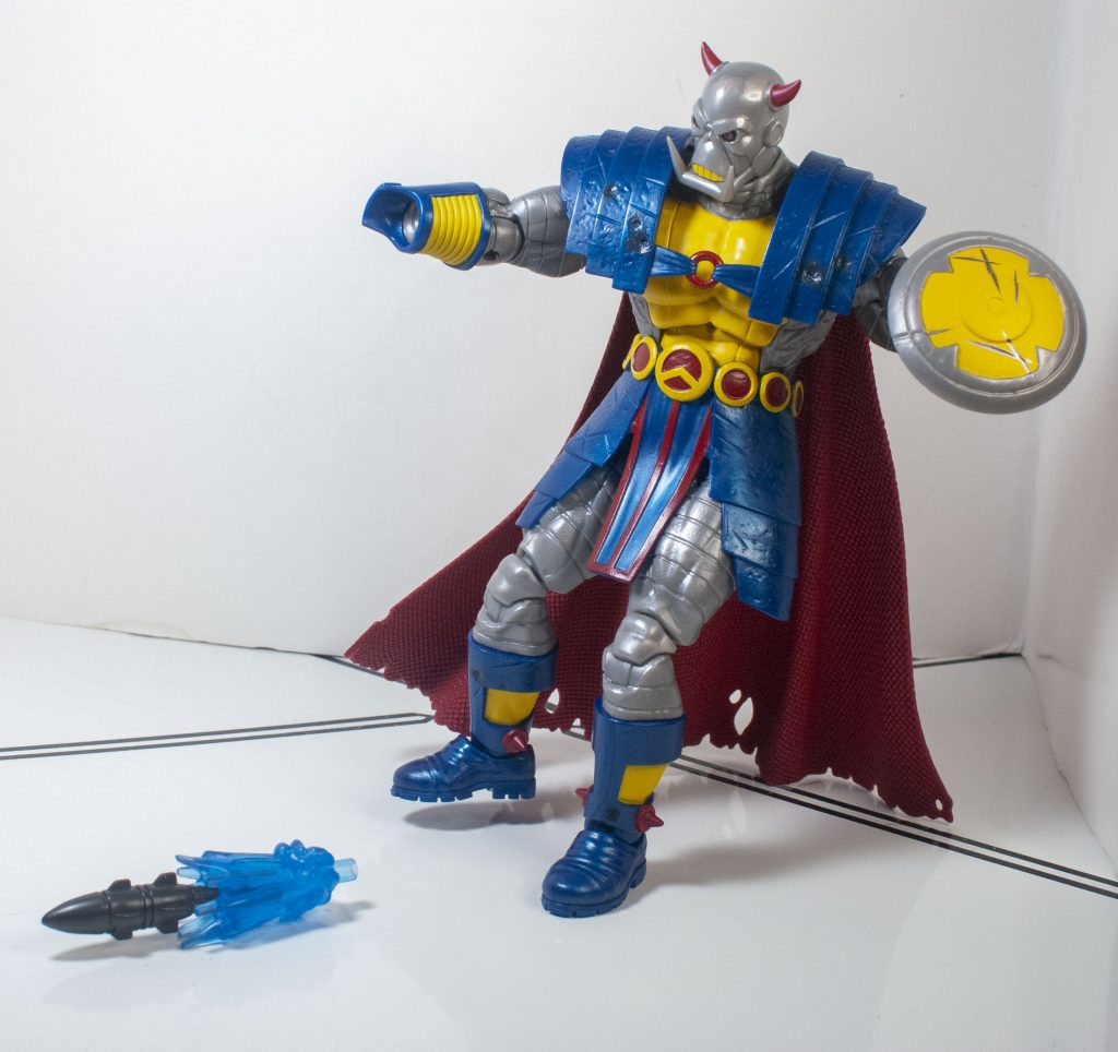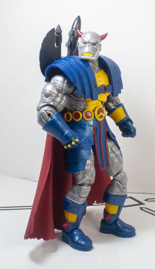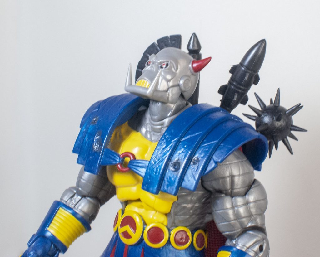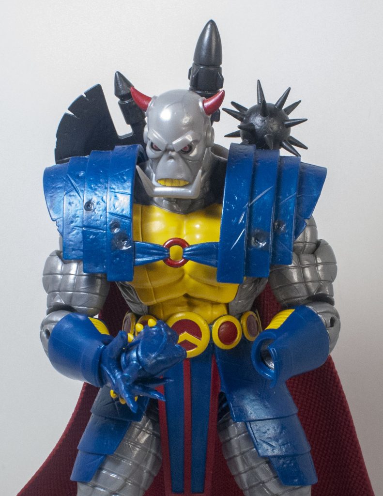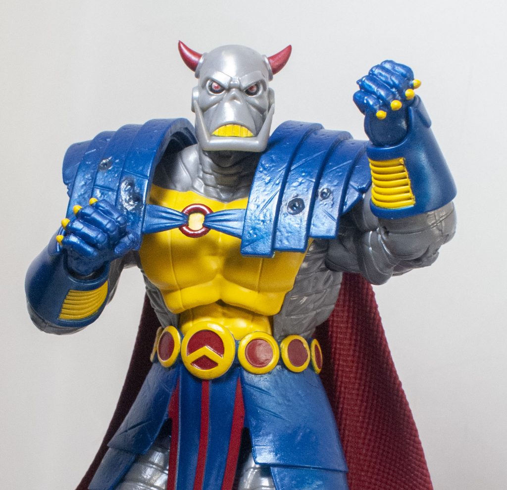 The change of clothes when Death’s Head moved to Mainstream Marvel also came with a slight color-readjustment, meaning that his outfit is mostly blue, instead of mostly green, but that’s the only thing that feels reflexively incorrect. Beneath the outfit, his skin’s mostly a shiny, metallic gray, with some yellow on his chest (and teeth), and a bit of red on his horns, and eyes, which are rimmed in black. They picked a good shade of gray, it manages to not look too plain, or wash out any detail.