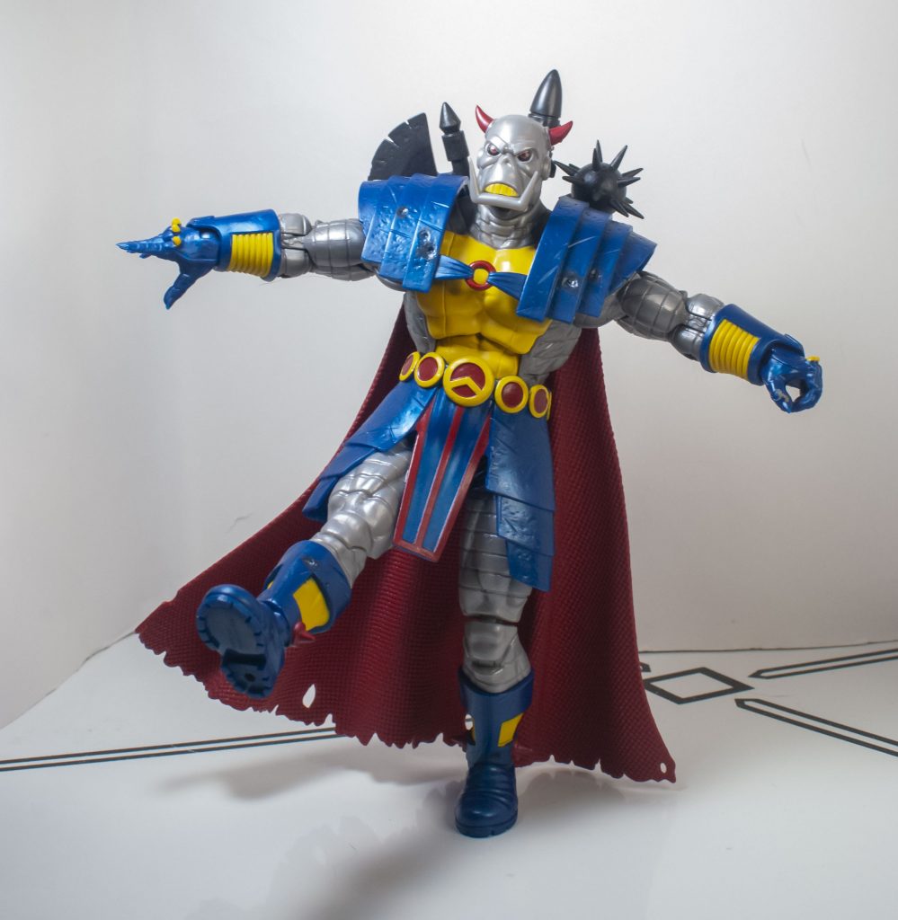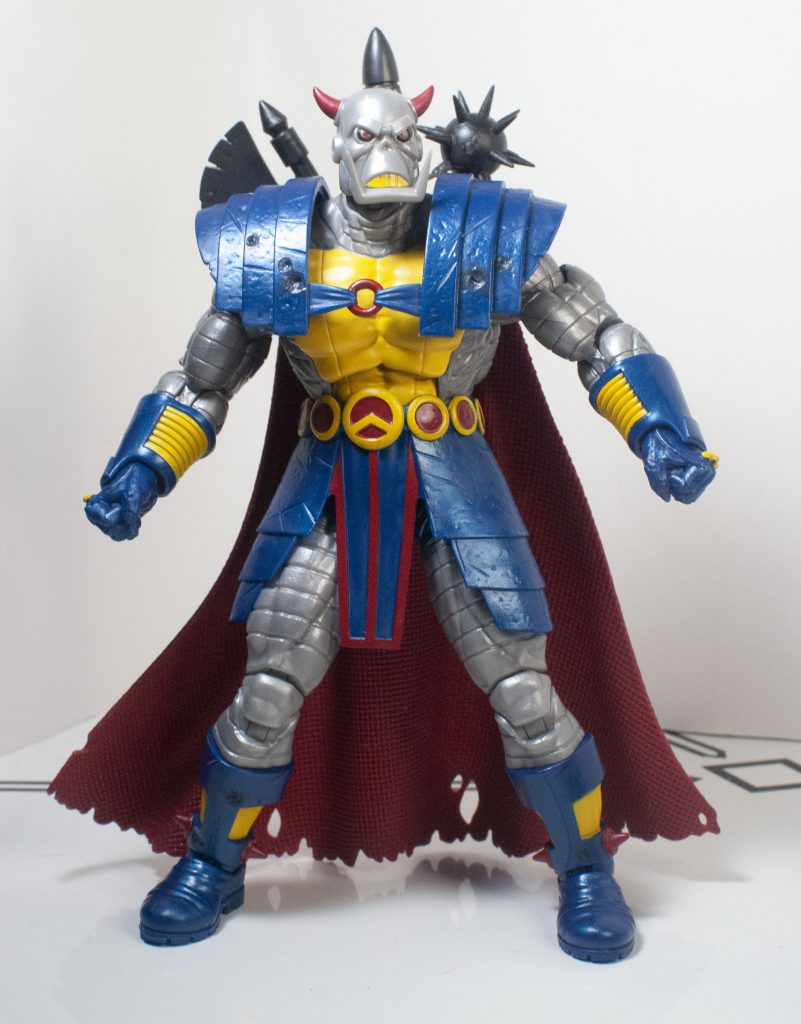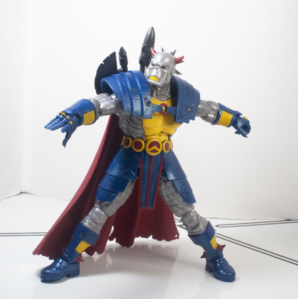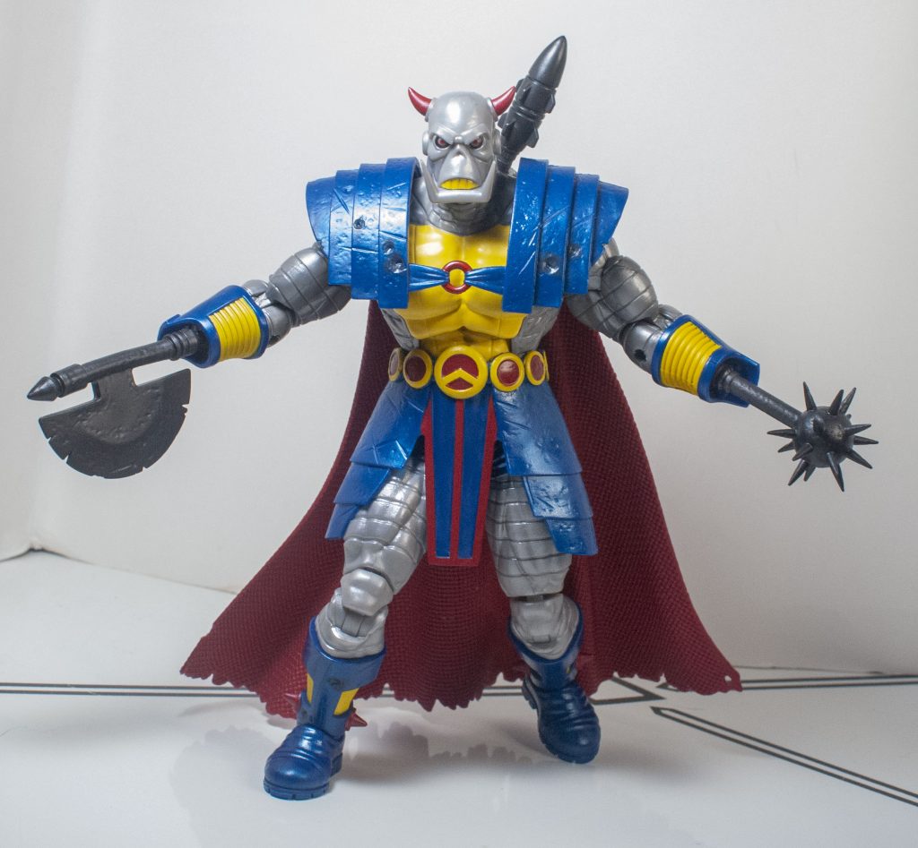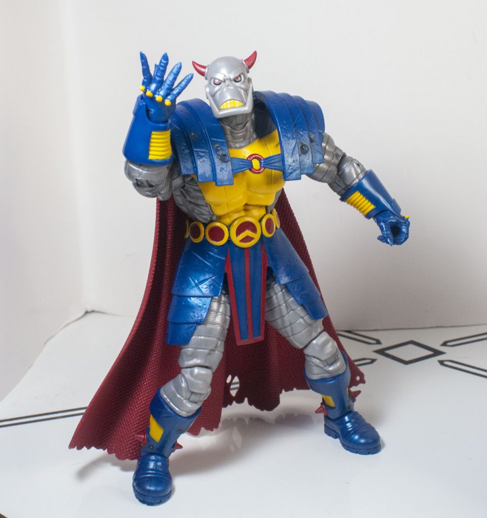 The change of clothes when Death’s Head moved to Mainstream Marvel also came with a slight color-readjustment, meaning that his outfit is mostly blue, instead of mostly green, but that’s the only thing that feels reflexively incorrect. Beneath the outfit, his skin’s mostly a shiny, metallic gray, with some yellow on his chest (and teeth), and a bit of red on his horns, and eyes, which are rimmed in black. They picked a good shade of gray, it manages to not look too plain, or wash out any detail.