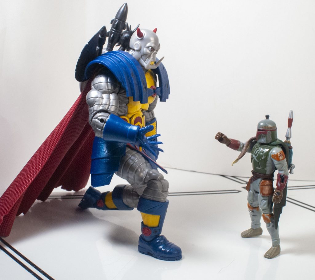 This is an area where, on paper, it’s really good, but in practice, he feels a little limited. So, Death’s Head has a good range of joints, including (but not limited to) multi-directional ankles and wrists, double-knees, multiple arm and leg swivels, an ab crunch, and a waist joint, despite his clothes. I particularly appreciate his double-neck joint, it lets him move his head around very effectively.