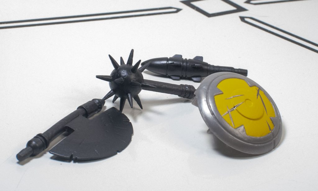 For weapons, he’s got three very dark gray impliments: An axe, with nicely-sculpted notches in it, a mace, and a missile/spear thing, all of which are reminiscent of weapons he used in the Transformers comics. He’s also got a shield, cast in gray, and painted yellow, again, with some nice wear and tear on it.