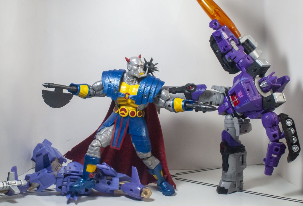 So, I like him on the strength of his aesthetics, and the fact that he fits nicely with both my Transformers, and my Non-Transformers, but whether or not I can recommend him to you depends on how important the “pick up and play” factor is. It’s not outright bad, like, say, a “meant for the shelf, and never to touch” third-party Transformer, or a NECA action figure. He’s just…slightly less pleasant than I feel he ought to be, which sort of fits the character, funny enough.