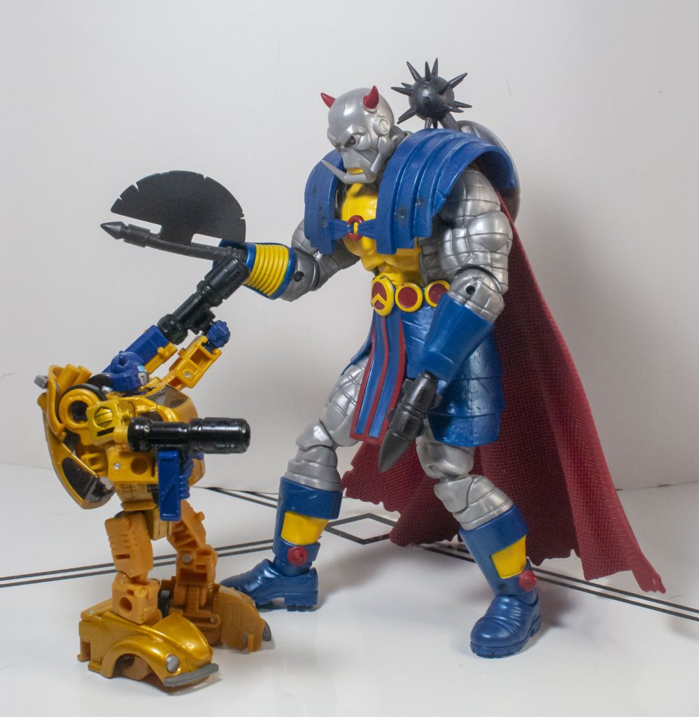Okay, that’s an exaggeration. But really, the sculpt on this guy is incredibly cool. He’s got immediate *presence* to him, once you pop him out of the box. It helps that he’s a bit bigger than your usual Marvel legend. Like, a head and a half taller, and a lot wider. Guy’s got mass, density, and charisma. And the scale actually works for me! See, I’m a Transformers collector first, and when it comes to non-Transformers figures, I tend to prefer smaller 4-inch characters, like mainline Star Wars, GI Joe, and Spider-Man Epic Hero Collection figures are, because they kinda-sorta scale with Transformers. 6-inchers like this guy are usually way too big. But Death’s Head was actually presented in the comics as being Transformers-sized instead of human-sized, so he actually does feel like he fits with my mainline Bots and Cons.