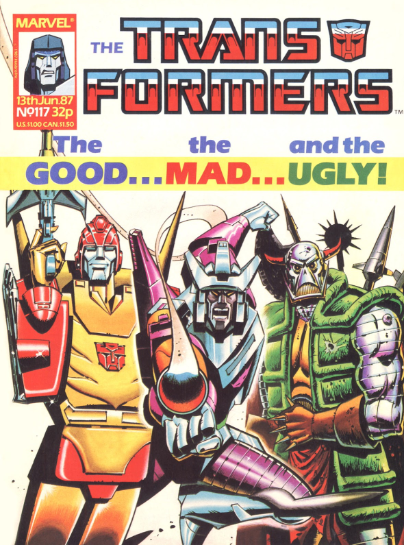 To begin with, let’s talk about Marvel UK’s Transformers comics. The American Marvel books we’re all familiar with were being published in the UK in the 80s as well, but as a weekly title, instead of a monthly one. Each issue had a smaller page count, so the American stories would be split into parts, and serialized, but still, they ran out of issues fast. To keep up with demand, a stable of British writers (eventually, just Simon Furman) and a team of artists began making UK-exclusive stories that took place between the American issues. But instead of making these fill-in stories literally filler, Furman and company decided to go hard, and tell tales with a much darker, grimmer, 2000 AD-esque sensibility, between the more colorful US reprints. And it worked, because the UK Transformers Comics were immensely popular, eclipsing even the cartoon in popularity in the UK. And it’s from these stories that we get Death’s Head.