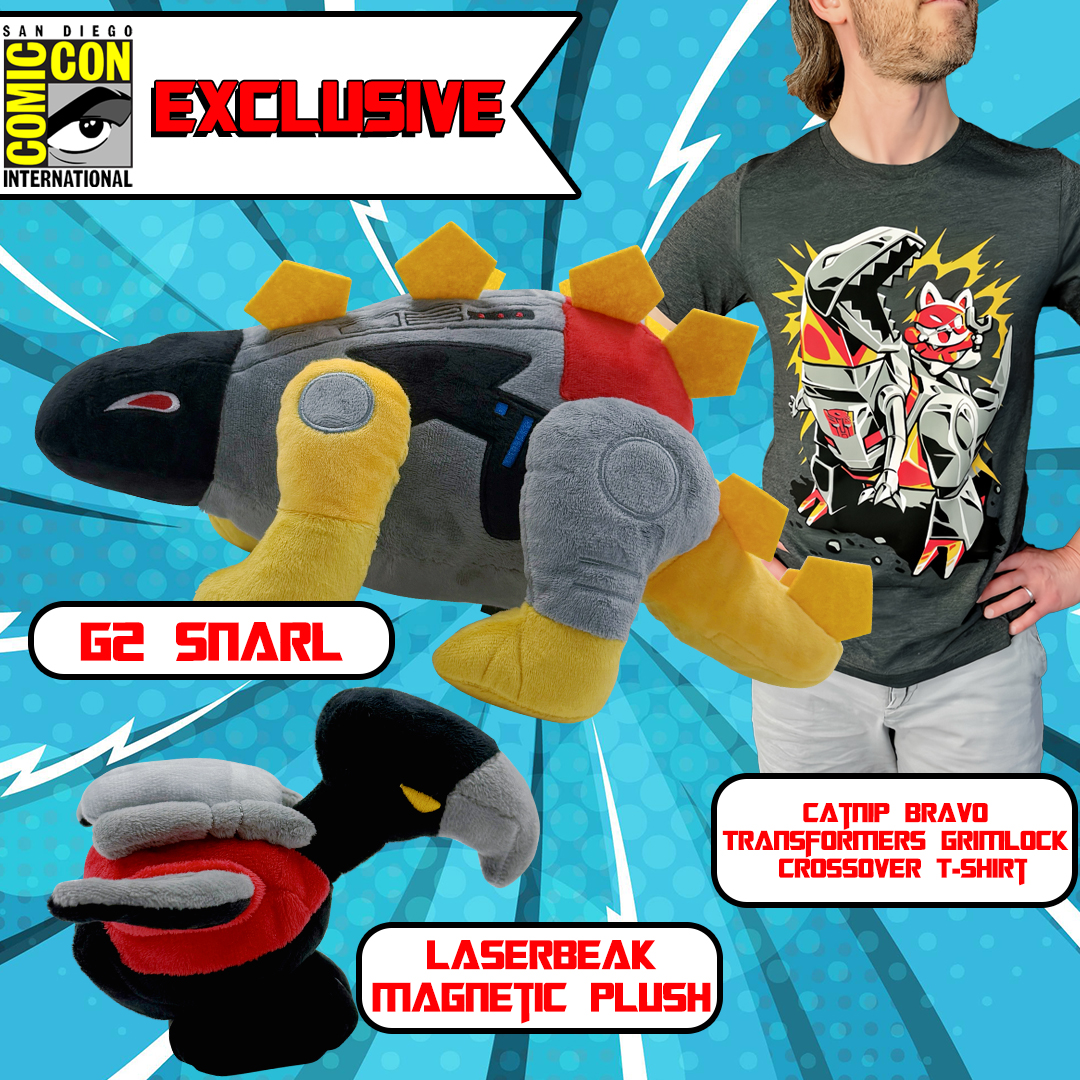 TFW2005 member Protoman expanded the list of officially licensed Symbiote Studios Transformers items scheduled for purchase availability at Comic-Con International: San Diego next month, to include: G2 Snarl Plush and Catnip Bravo x Grimlock t-shirt. Sound off on the 2005 boards! Here’s your very first look at the exclusive items we’re bringing to San Diego Comic-Con this year! We’ll have limited quantities of new Transformers G2 Snarl and magnetic Laserbeak plushes as well as our Catnip Bravo x Grimlock crossover t-shirt. See you in San Diego! Snarl: Continuing Symbiote Studios’ set of the iconic Transformers Dinobots alongside Grimlock, Sludge and » Continue Reading.