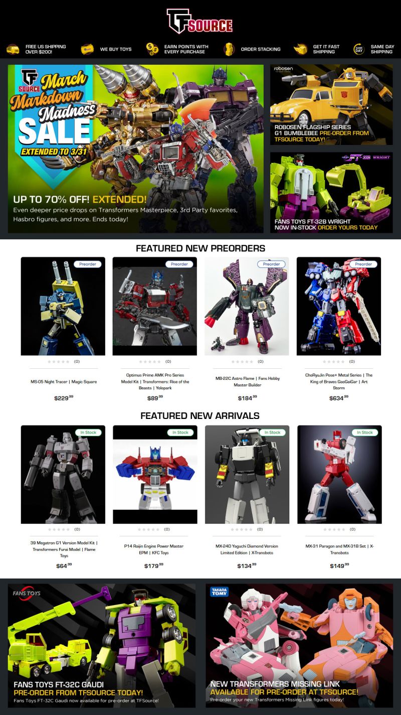 TFSource Sponsor News – Final Day to Save up to 70% Off during our March Markdown Madness Sale! New Preorders!- G1 Bumblebee Auto-Converting Robot | Transformers Flagship Series Collector’s Edition | Robosen- MS-05 Night Tracer | Magic Square- Optimus Prime AMK Pro Series Model Kit | Transformers: Rise of the Beasts | Yolopark- MB-22C Astro Flame | Fans Hobby Master Builder- ChoRyuJin Pose+ Metal Series | The King of Braves GaoGaiGar | Art Storm- Dirge MDLX Scale Collectible Figure | Transformers | Threezero- DK-59 Upgrade Kit for Transformers Studio Series 86-31 Optimus Prime | DNA Design- MX-46L Lignite | X-Transbots MasterX- JGM-Q01 Steel Head Commander Battle Edition | Super Deformed | Laser Cat Toy- Fans Toys FT-32C Gaudi New Instock Items!- Fans Toys FT-32B Wright- 39 Megatron G1 Version Model Kit | Transformers Furai Model | Flame Toys- P14 Raijin Engine Power Master EPM | KFC Toys- Nemesis Prime DLX Scale Collectible Figure | Transformers: The Last Knight | threezero- Voltron 40th Anniversary C <br> See more at https://tformers.com/54844 <br>